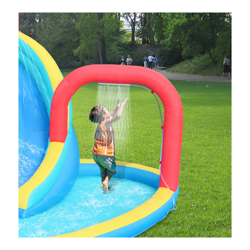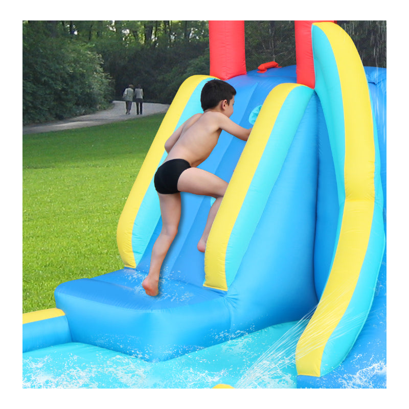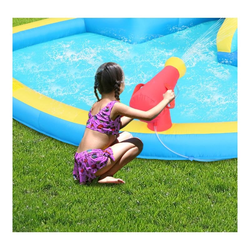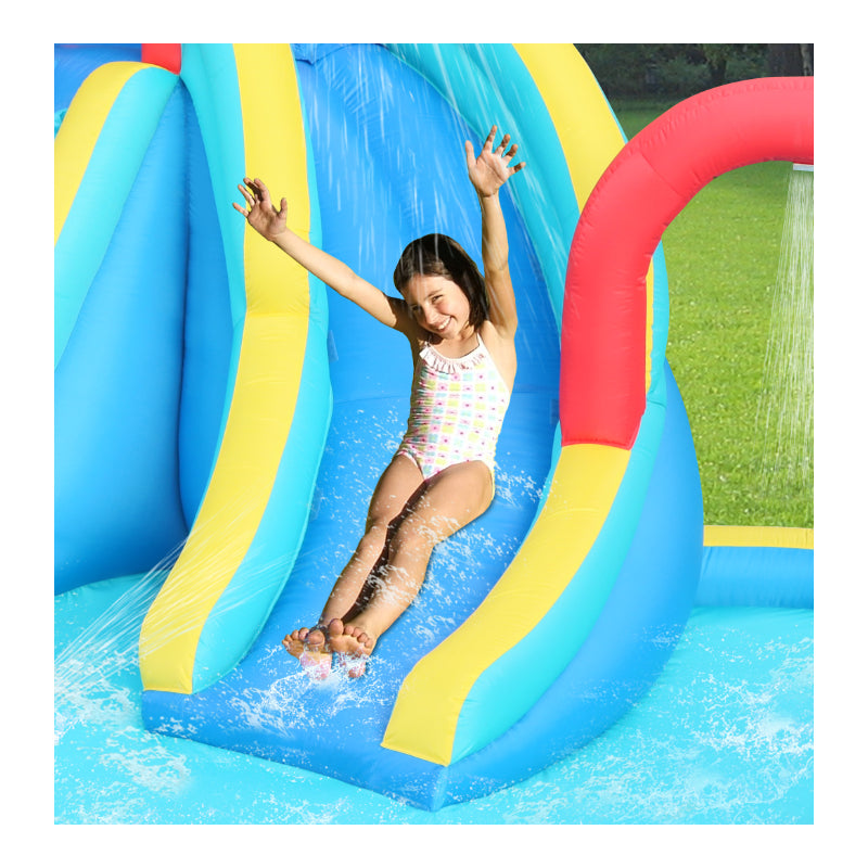 Unleash a tidal wave of fun with the Happy Hop Waterslide! Perfect for children aged 3 to 10, this inflatable marvel features a climbing wall for aspiring adventurers, and a spacious splash pool for endless aquatic antics. The vibrant design, highlighted with bright blue, yellow, and red, makes for an inviting and exhilarating water playground. Kids will delight in the built-in water sprayers and the fun water cannon, adding an extra layer of interactive play. Easy to set up and robust in construction, the Happy Hop Waterslide is the ultimate solution for cool, refreshing summer entertainment. Make a splash and create unforgettable memories with this fantastic waterslide!