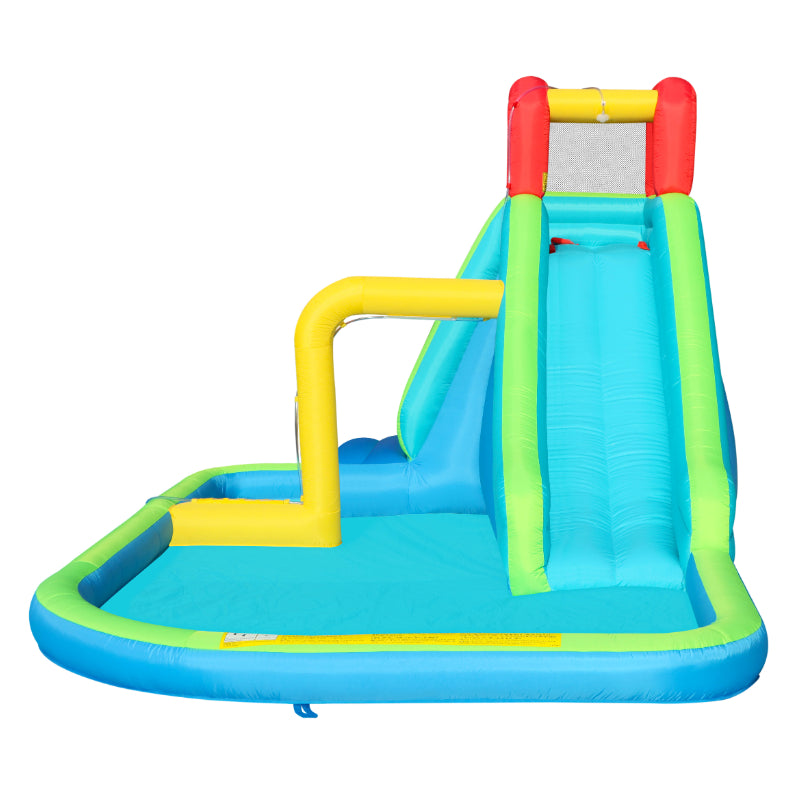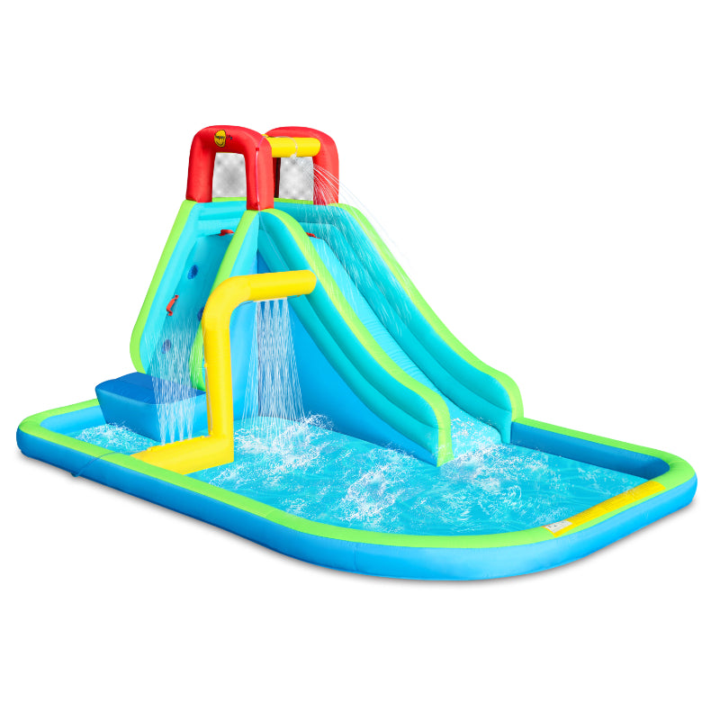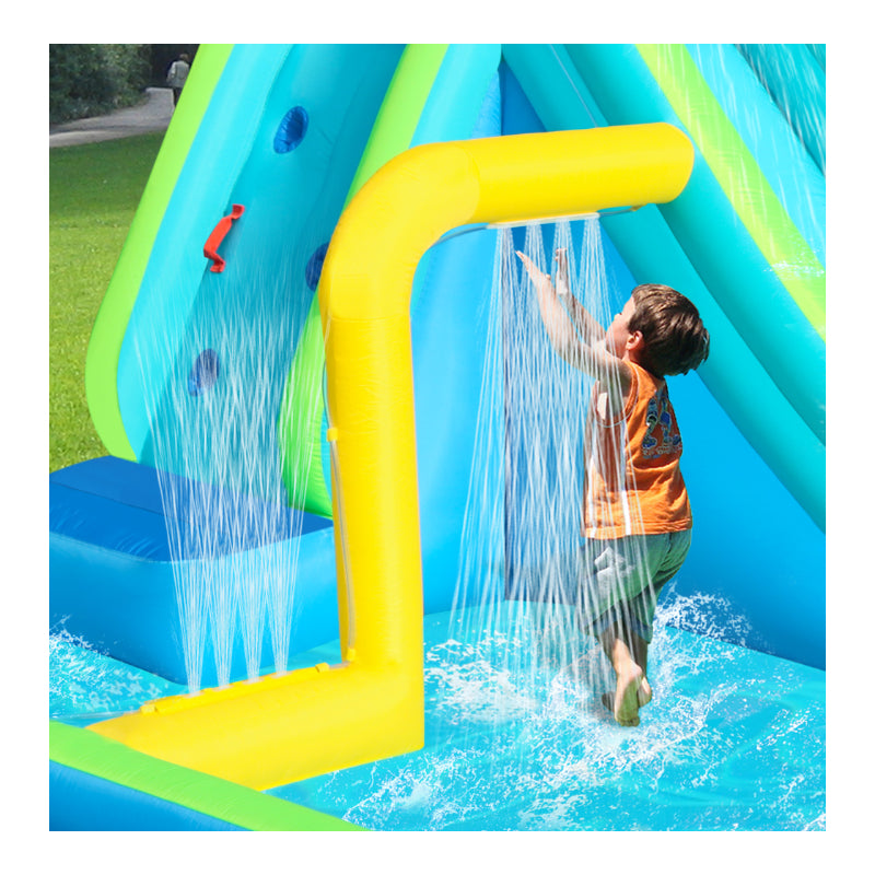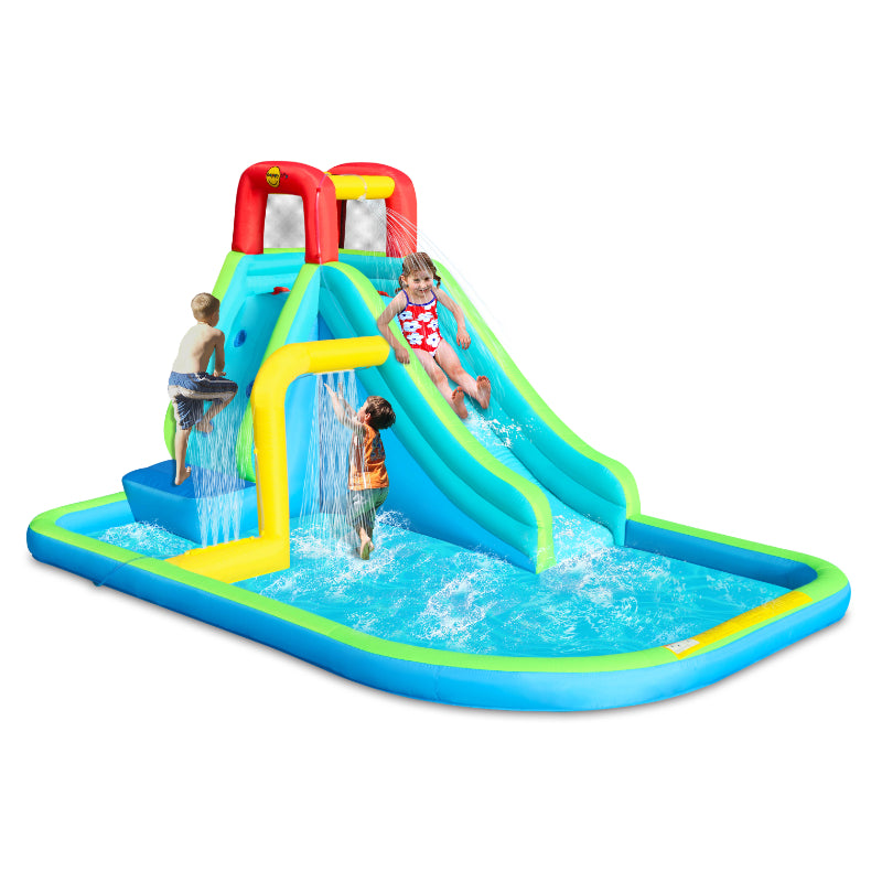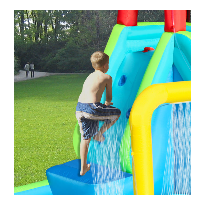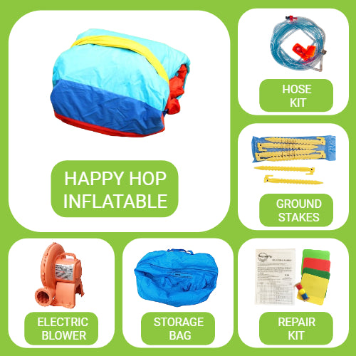 Dive into a splash-filled adventure with the Happy Hop Waterslide! Perfect for children aged 3 to 10, this vibrant inflatable features a climbing wall for little adventurers, and a refreshing splash pool at the bottom. The playful design, adorned in bright blue, green, and red, creates an enticing water playground in your backyard. Kids will love the built-in water sprayers that keep the slides slick and cool, providing hours of wet and wild entertainment. Easy to set up and built to last, the Happy Hop Waterslide is the ultimate way to beat the heat and make unforgettable summer memories. Get ready to slide, splash, and play all day!