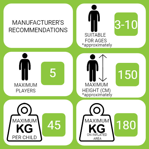 - Max weight: 180kg on inflated area (excluding splash pools)